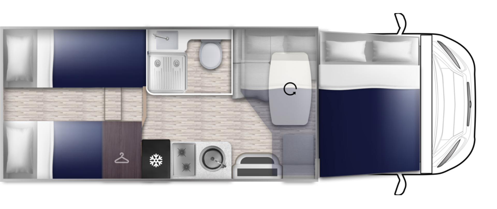 קרוואן זה מסדרת "תא עליון" מתאים לעד 4 מבוגרים וילד אחד. כולל מיטה זוגית מעל תא הנהג, שתי מיטות יחיד אחוריות הניתנות להפיכה למיטה זוגית גדולה, פינת אוכל ההופכת למיטת ילד, מטבח, מקלחת ושירותים.