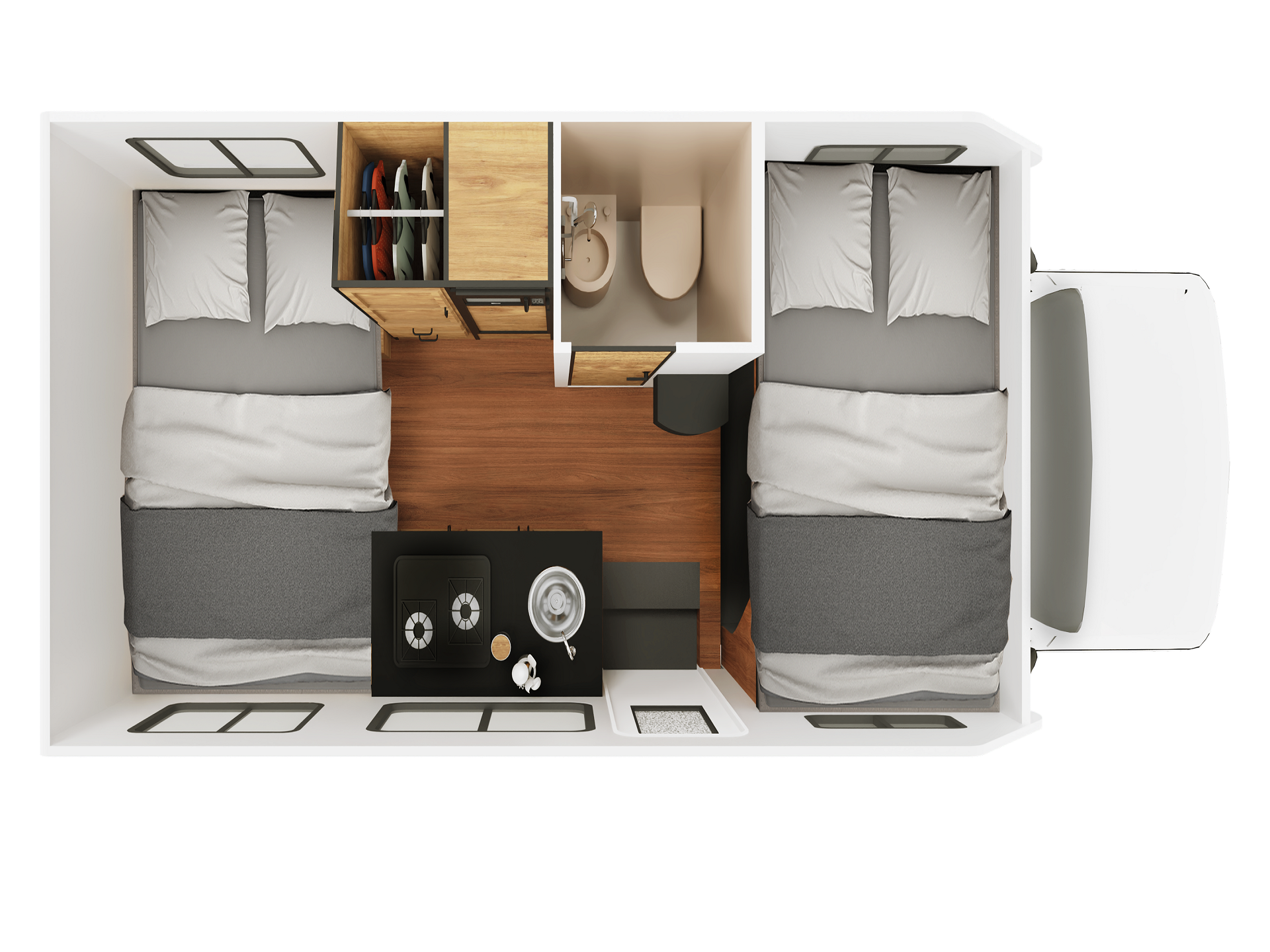 כולל מיטה זוגית מעל תא הנהג, פינת ישיבה אחורית ההופכת למיטה זוגית, מטבח, מקלחת ושירותים.