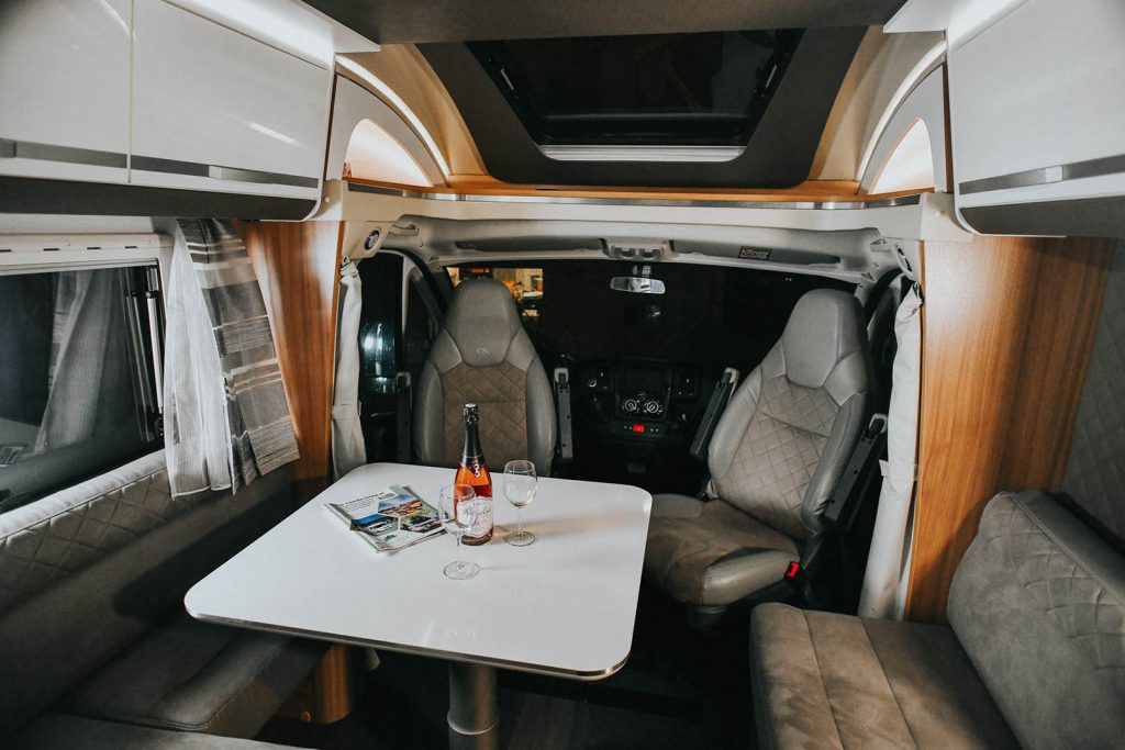 הקרוואן כולל מיטה זוגית בחלק האחורי של הקרוואן, מיטה זוגית היורדת מעל פינת האוכל, פינת אוכל, מטבח, מקלחת ושירותים.