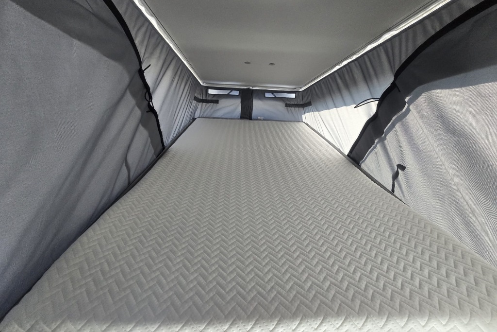 הקרוואן כולל מיטה זוגית בחלק האחורי של הקרוואן, גג נפתח לחלל עליון עם מיטה לילדים, פינת אוכל, מטבח, מקלחת ושירותים.