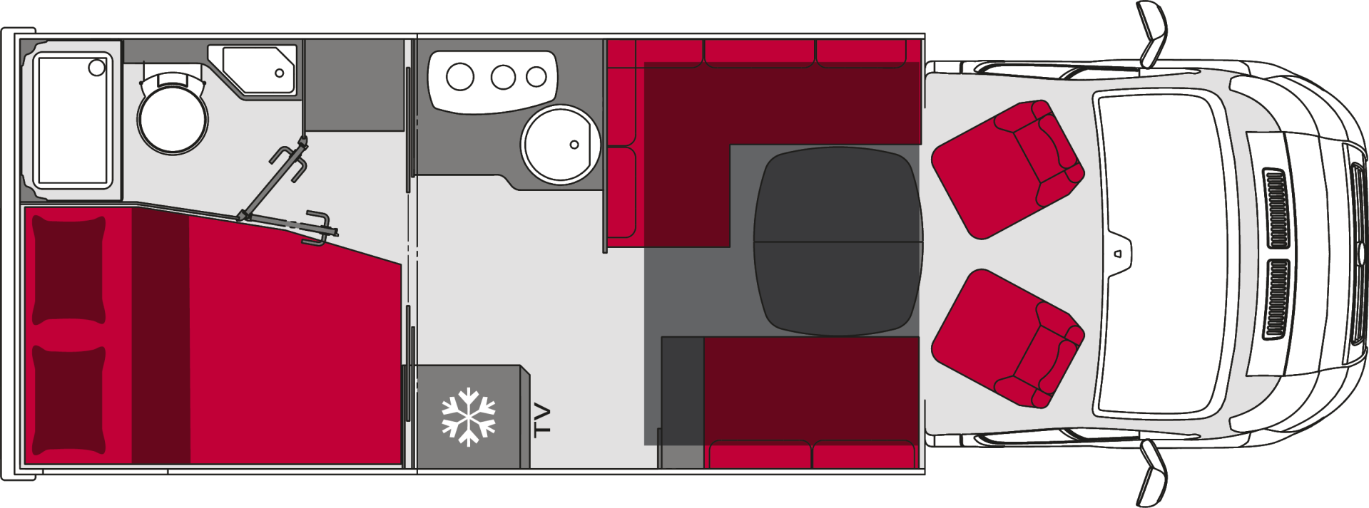 הקרוואן כולל מיטה זוגית בחלק האחורי של הקרוואן מיטה זוגית יורדת מעל פינת האוכל, פינת אוכל, מטבח, מקלחת ושירותים