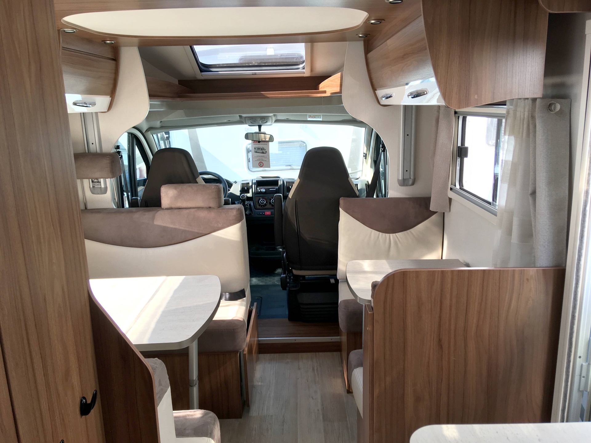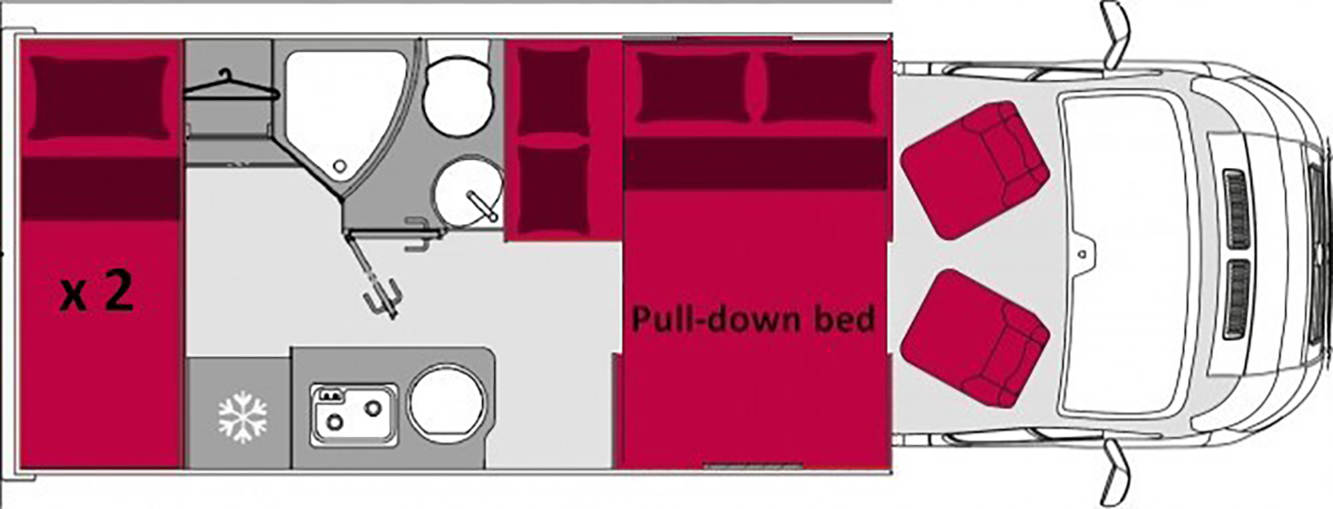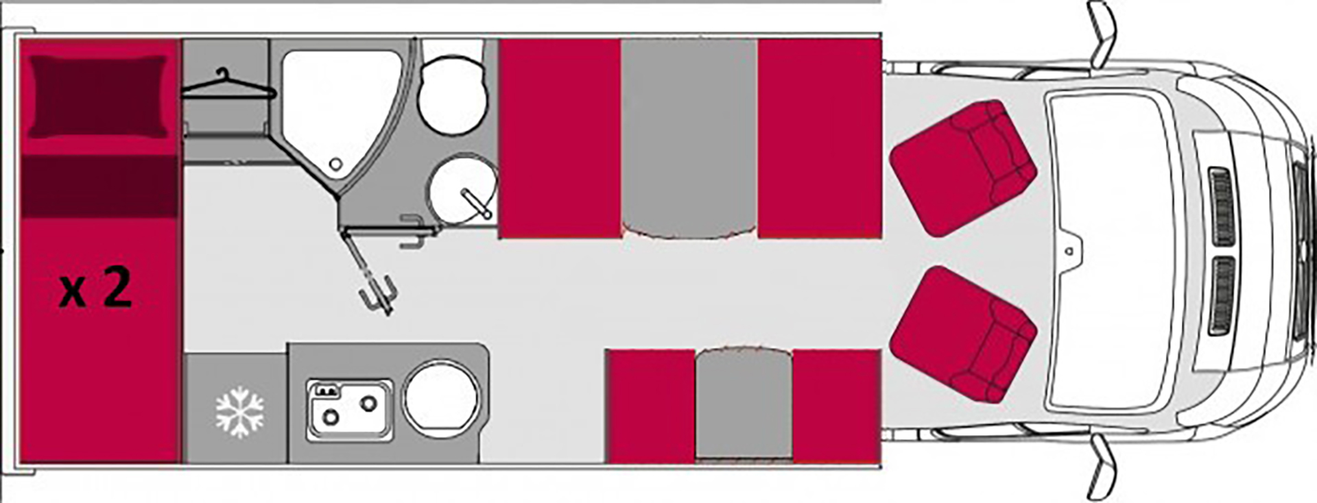 כולל מיטה זוגית יורדת מעל פינת האוכל, פינת אוכל ההופכת למיטת יחיד, מיטת קומתיים בחלק האחורי של הקרוואן, מטבח, מקלחת ושירותים