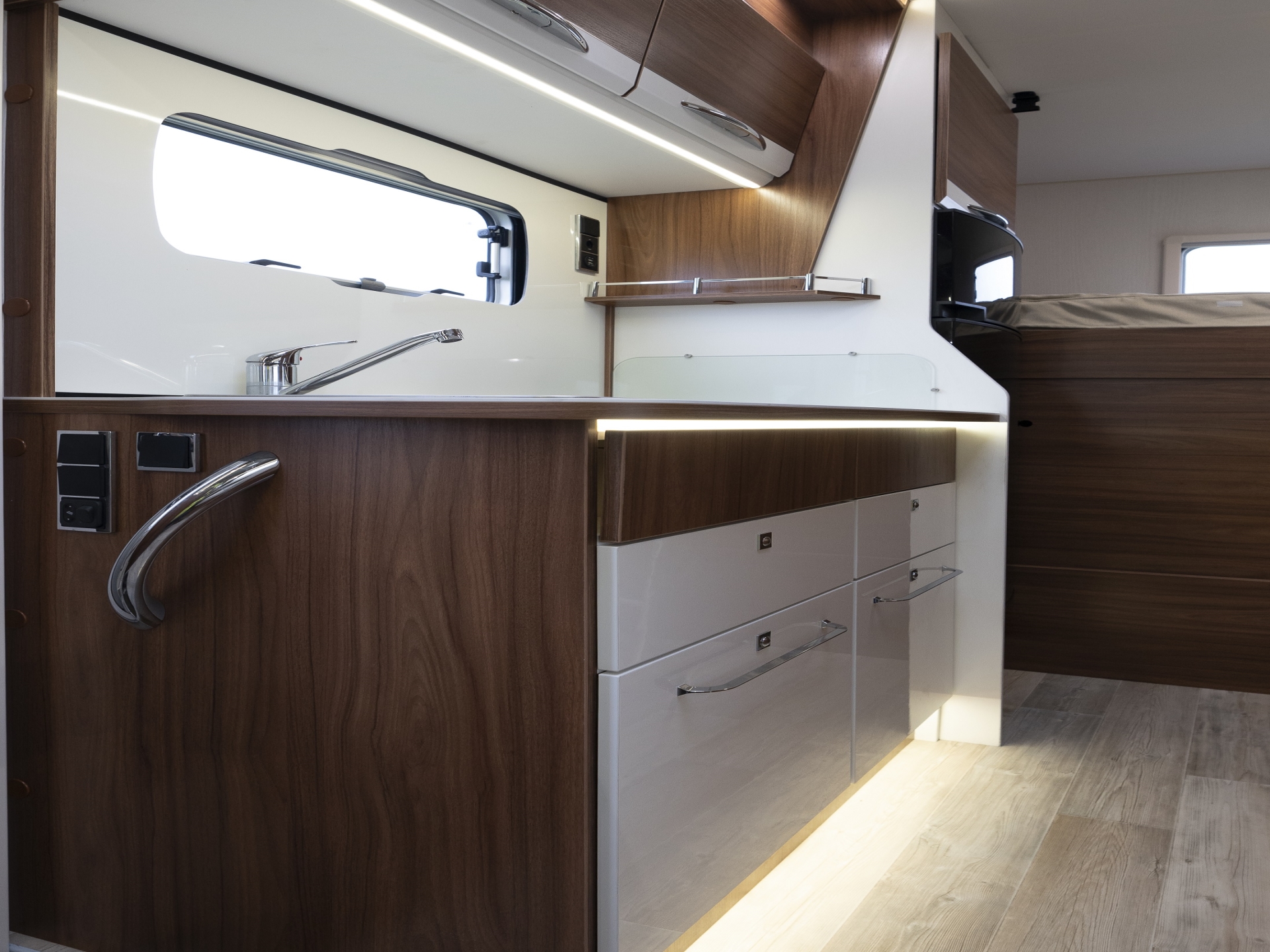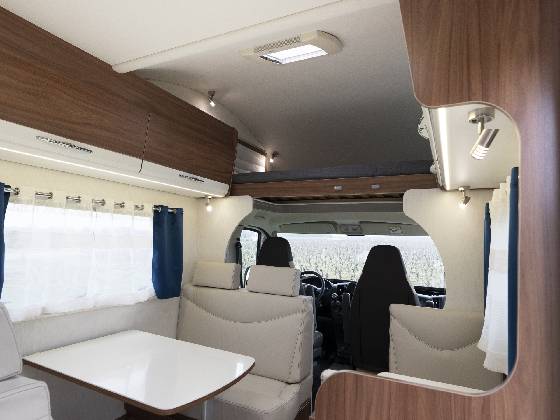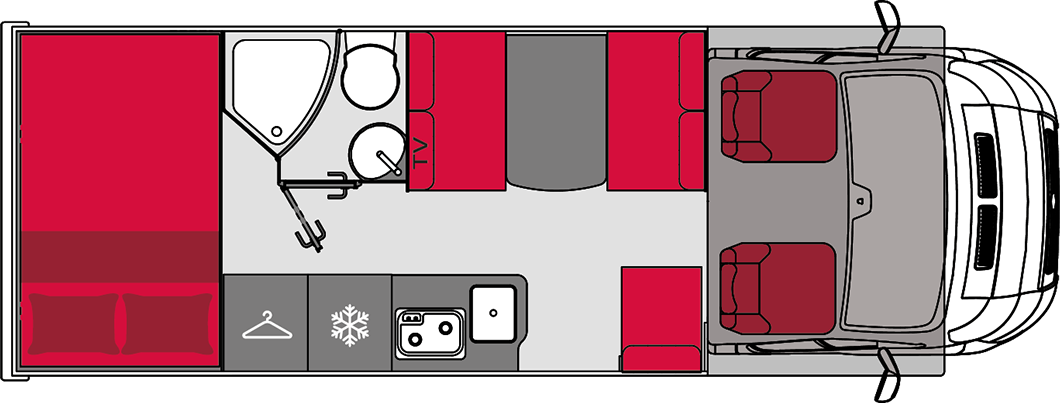 הקרוואן כולל מיטה זוגית קבועה מעל תא הנהג, פינת אוכל ההופכת למיטה זוגית, מיטה זוגית אחורית קבועה, מטבח, מקלחת ושירותים.
