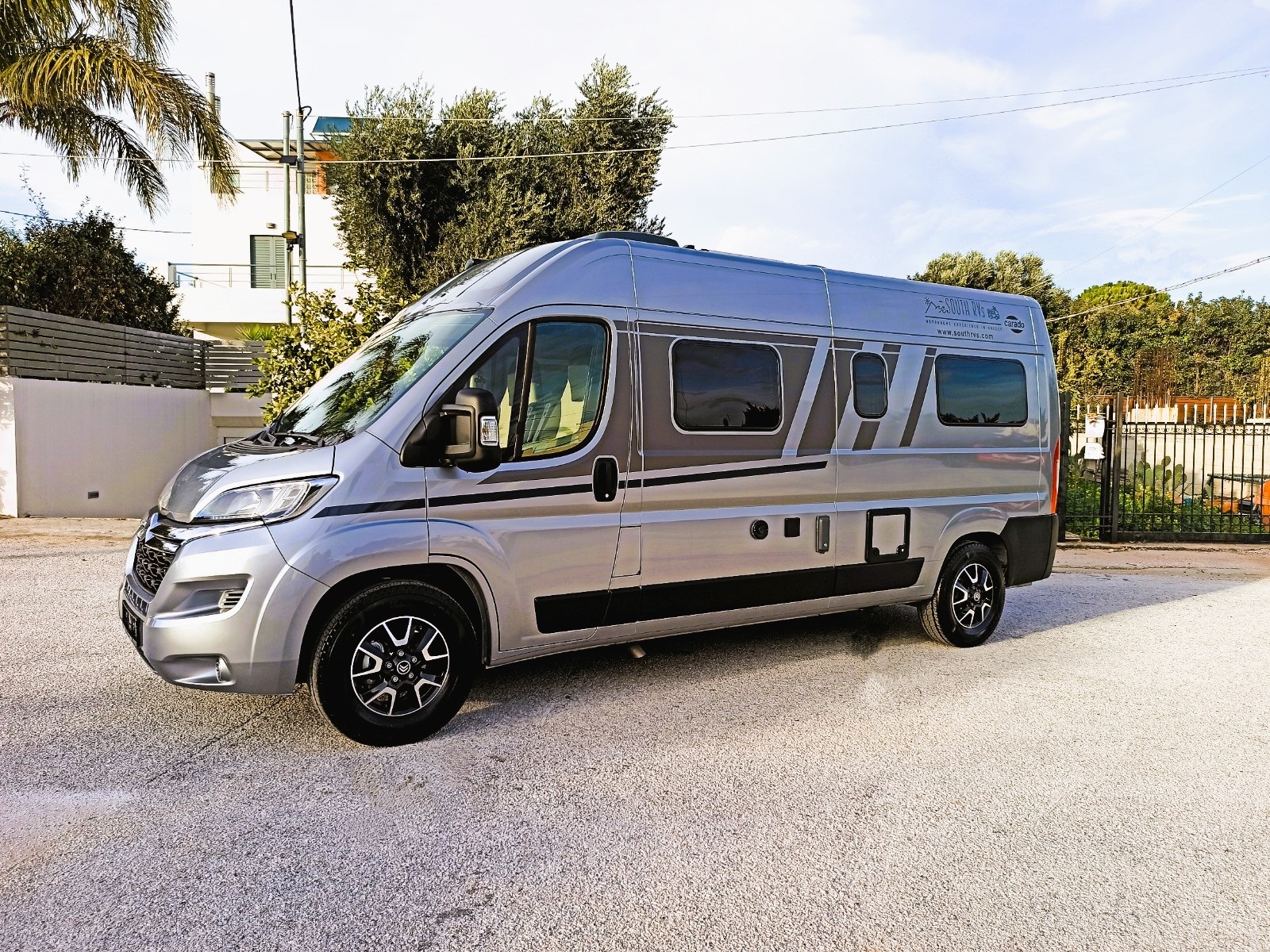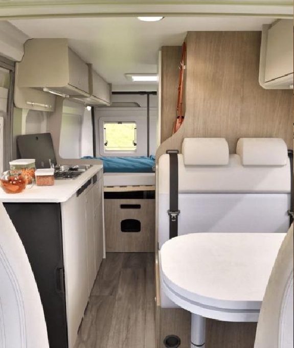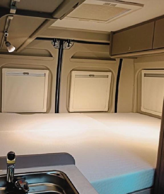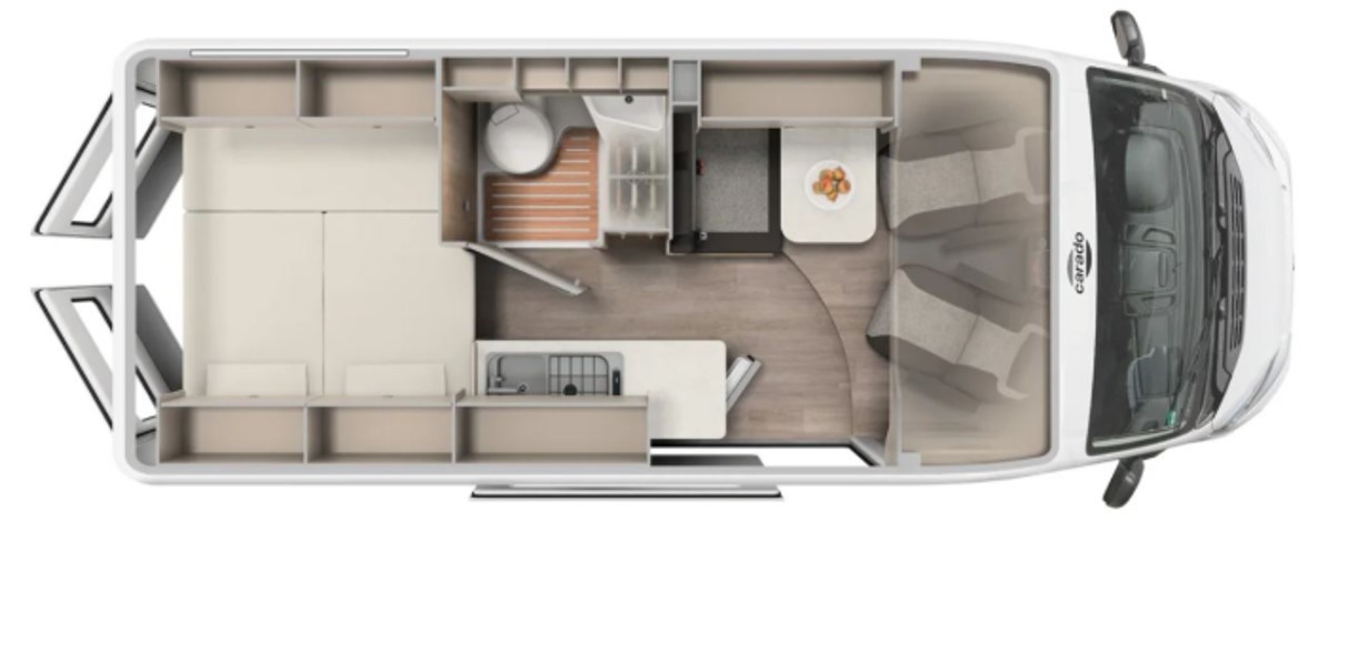 קרוואן מסדרת "מולטי וואן" מתאים ל-2 מבוגרים וילד. עם מיטה זוגית רחבה בחלק האחורי קבועה לרוחב הקרוואן ומיטת יחיד נפתחת מפינת האוכל.
