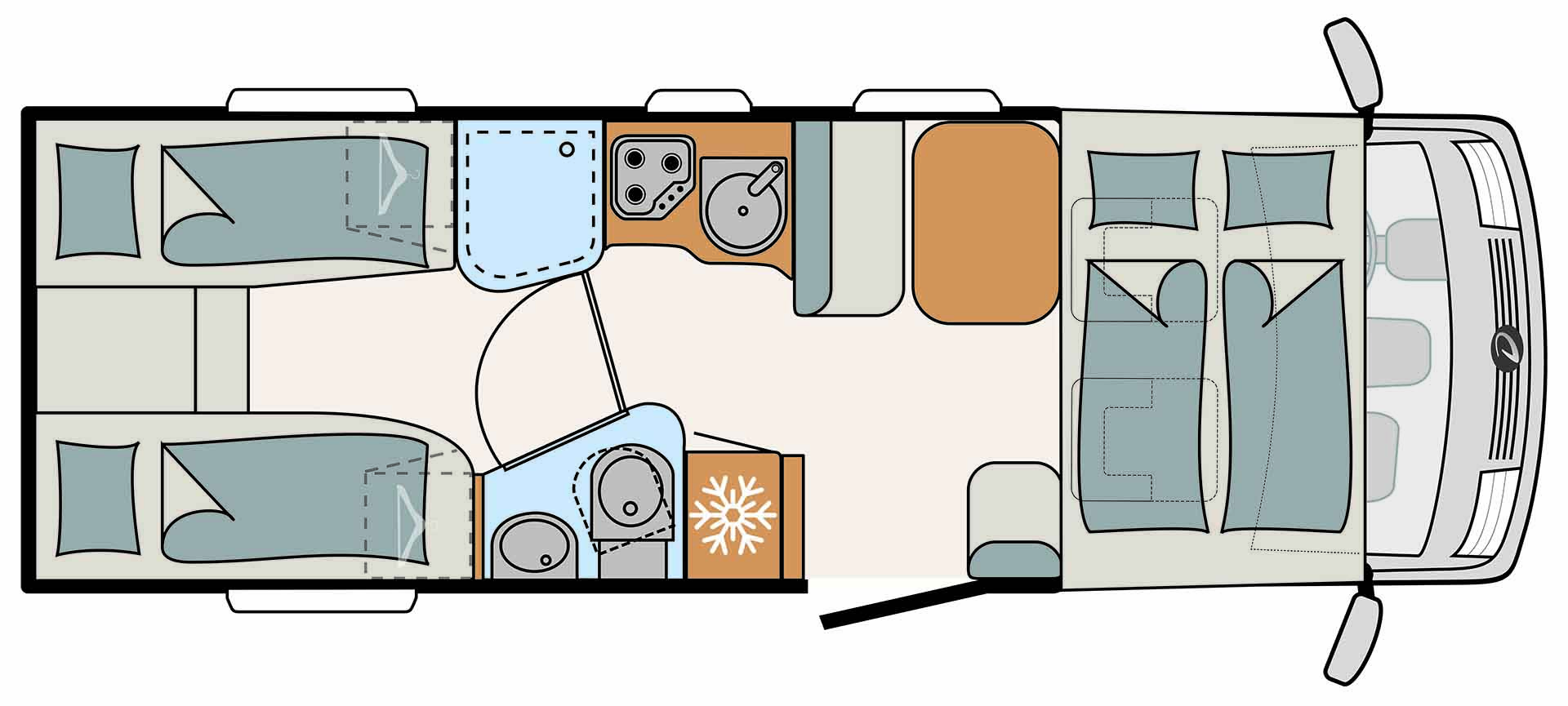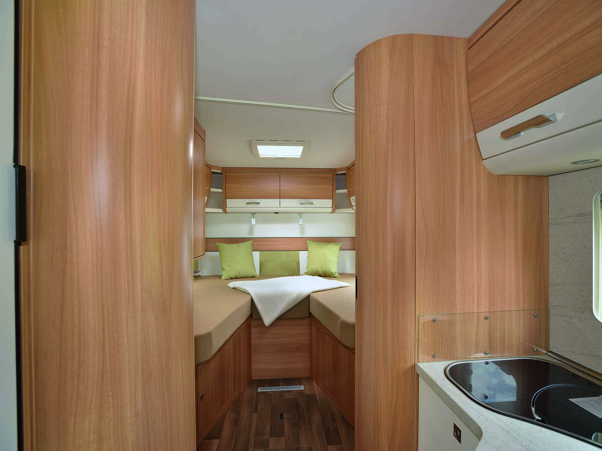 קרוואן זה מסדרת ""משולב מלא"" מתאים ל- 4 מבוגרים ומגיע עם מיטה זוגית נשלפת מעל תא הנהג ועוד 2 מיטות יחיד מאחור.