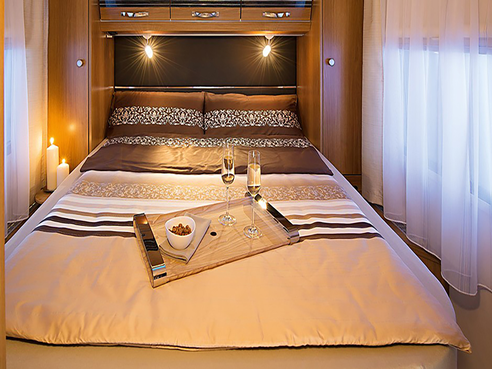 הקרוואן כולל מיטה זוגית נשלפת מעל תא הנהג ועוד מיטה זוגית מאחור, פינת אוכל, מטבח, מקלחת ושירותים