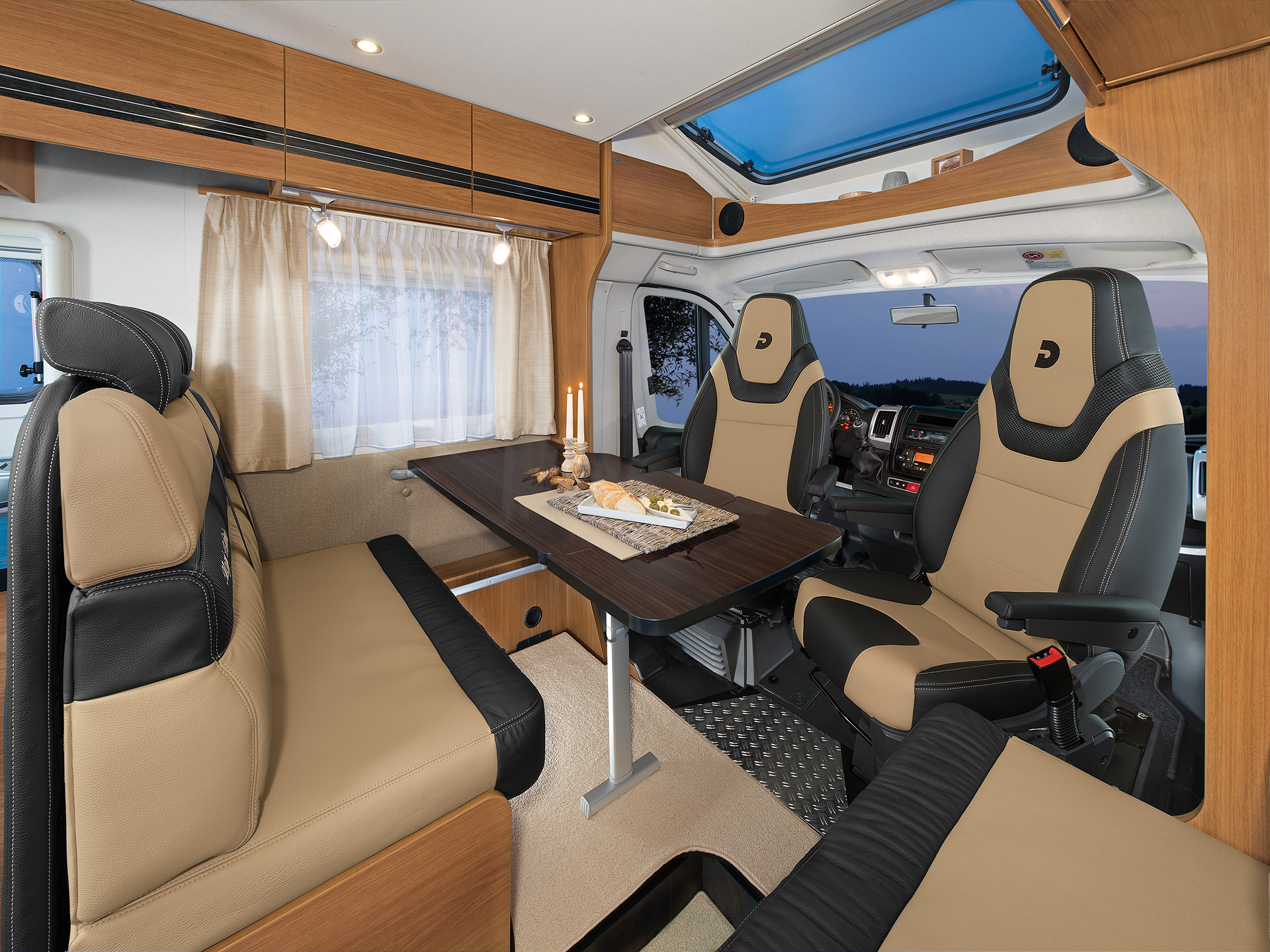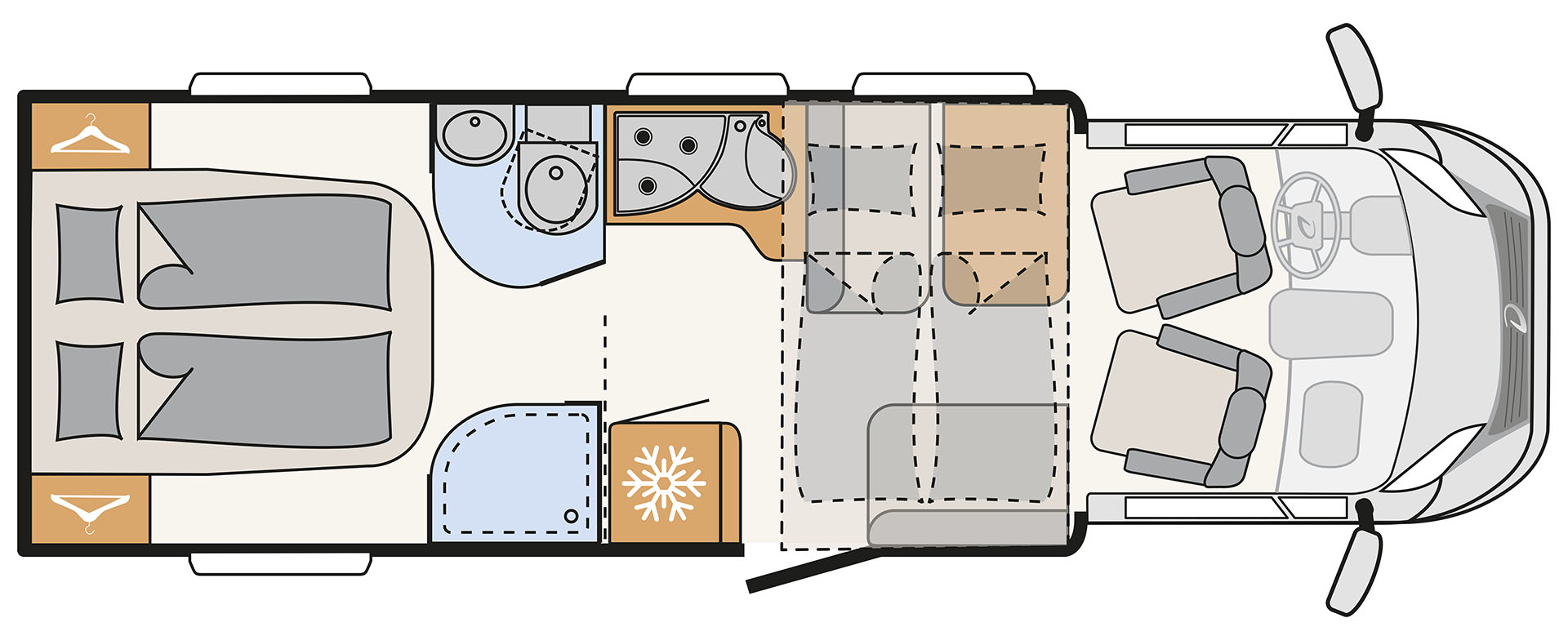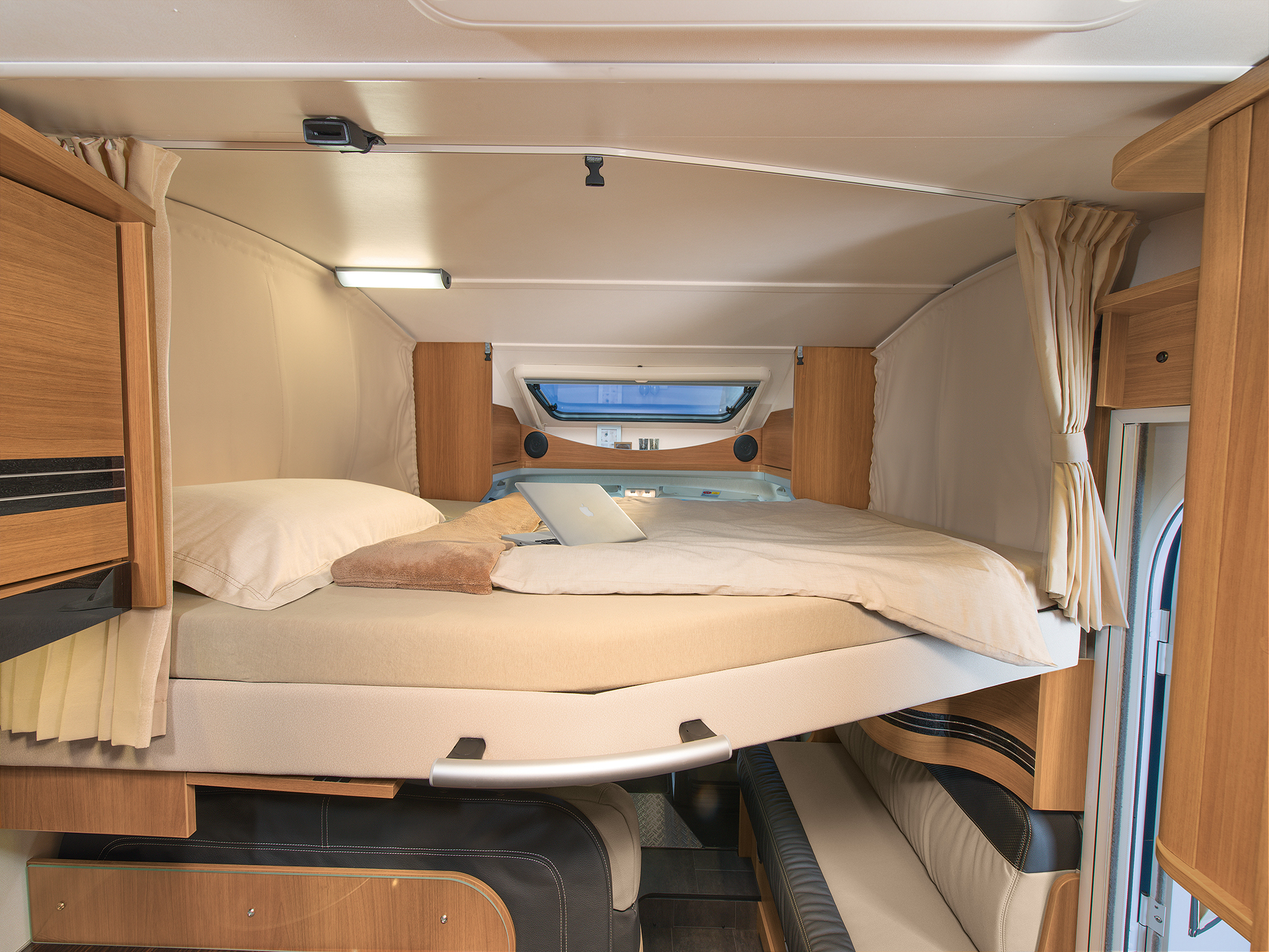 קרוואן זה מסדרת "משולב חלקי" מתאים ל- 4 מבוגרים ומגיע עם מיטה זוגית נשלפת מעל תא הנהג ועוד מיטה זוגית מאחור.