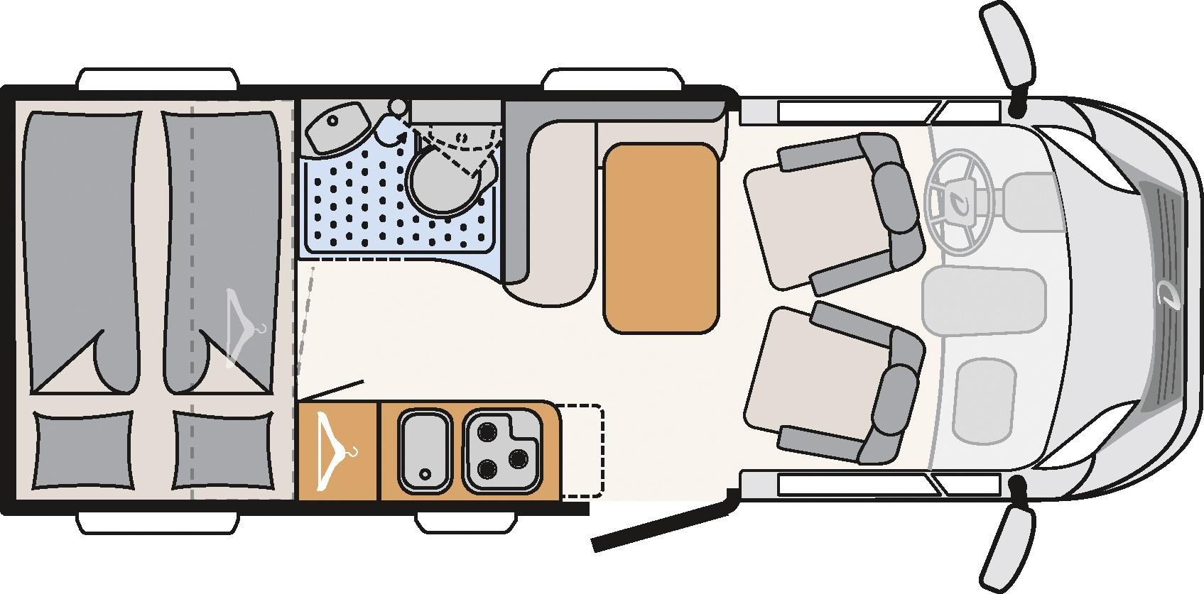 קרוואן זה מסדרת "משולב חלקי" מתאים לעד 2 מבוגרים ומגיעה עם מיטה זוגיות אחורית קבועה, פינת אוכל, מטבח, מקלחת ושירותים.
