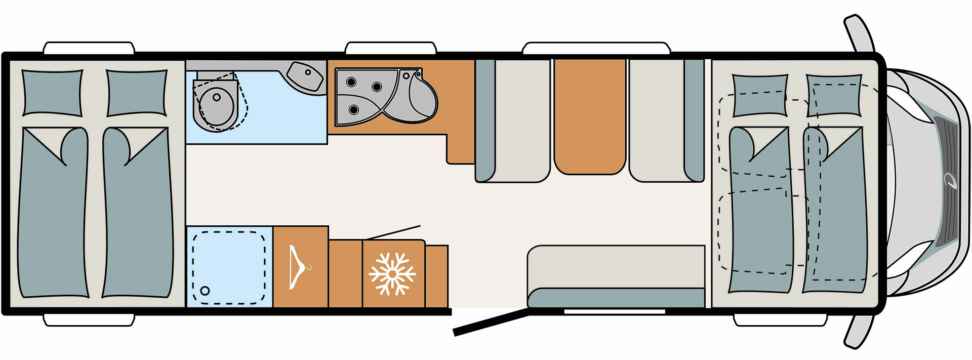 כולל מיטה זוגית קבועה מעל תא הנהג, שולחן אוכל ההופך למיטה זוגית ועוד מיטה זוגית קבועה בחלק האחורי של הקרוואן, פינת אוכל, מטבח, מקלחת ושירותים.