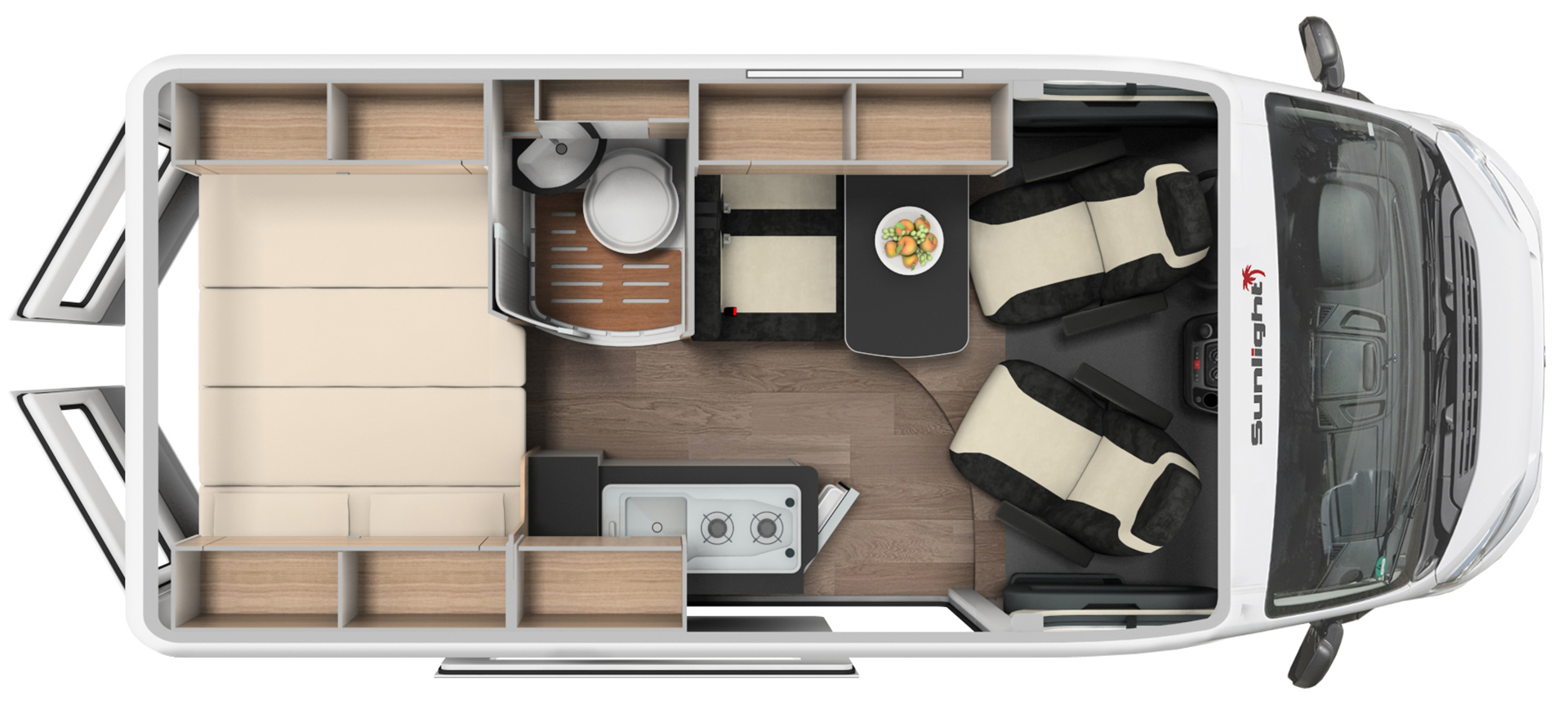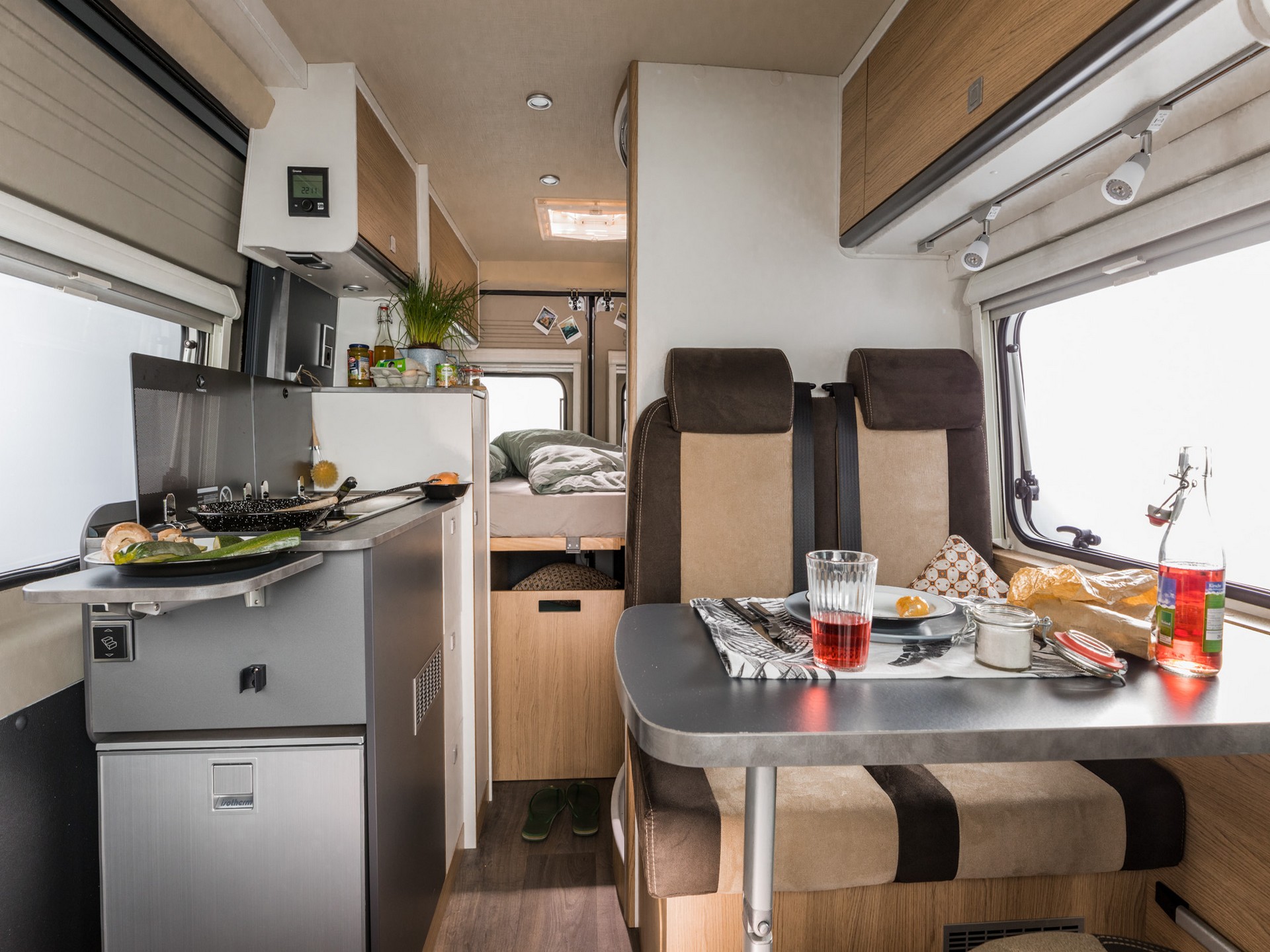 קרוואן זה מסדרת "מולטי וואן " מתאים לעד 2 מבוגרים. כולל מיטה זוגית קבוע מאחור, פינת אוכל, מטבח, מקלחת ושירותים.