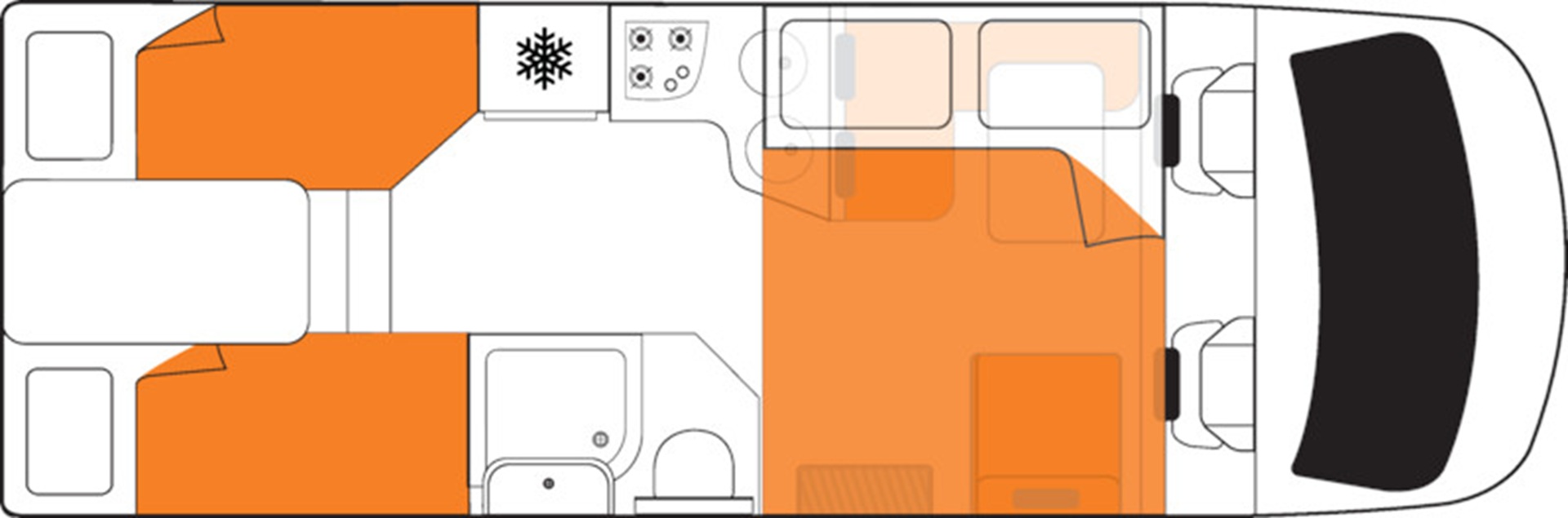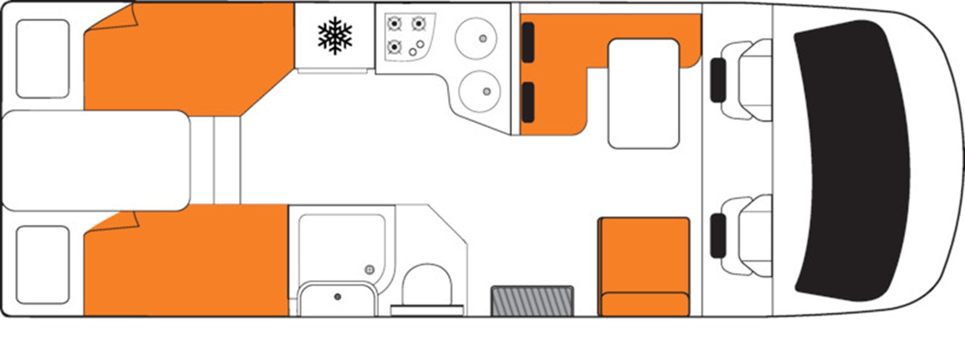 כולל 2 מיטות יחיד הניתנות להפיכה למיטה זוגית, מיטה זוגית יורדת מעל פינת האוכל, פינת אוכל, מקלחת, שירותים ומטבח. הקרוואן הוא בעל מערכת סגורה לנושא איכות הסביבה (Self Contained) וניתן לחנות איתם גם לא בחניונים מוסדרים והכל על פי הכללים וההנחיות.