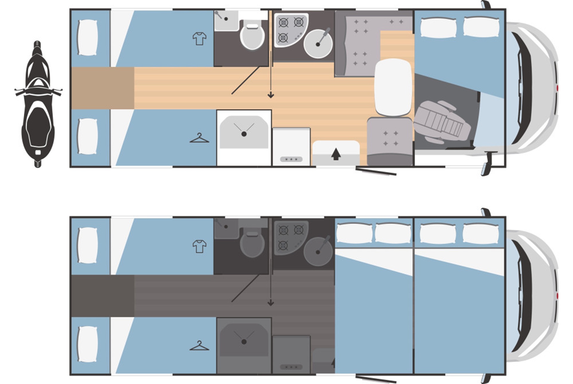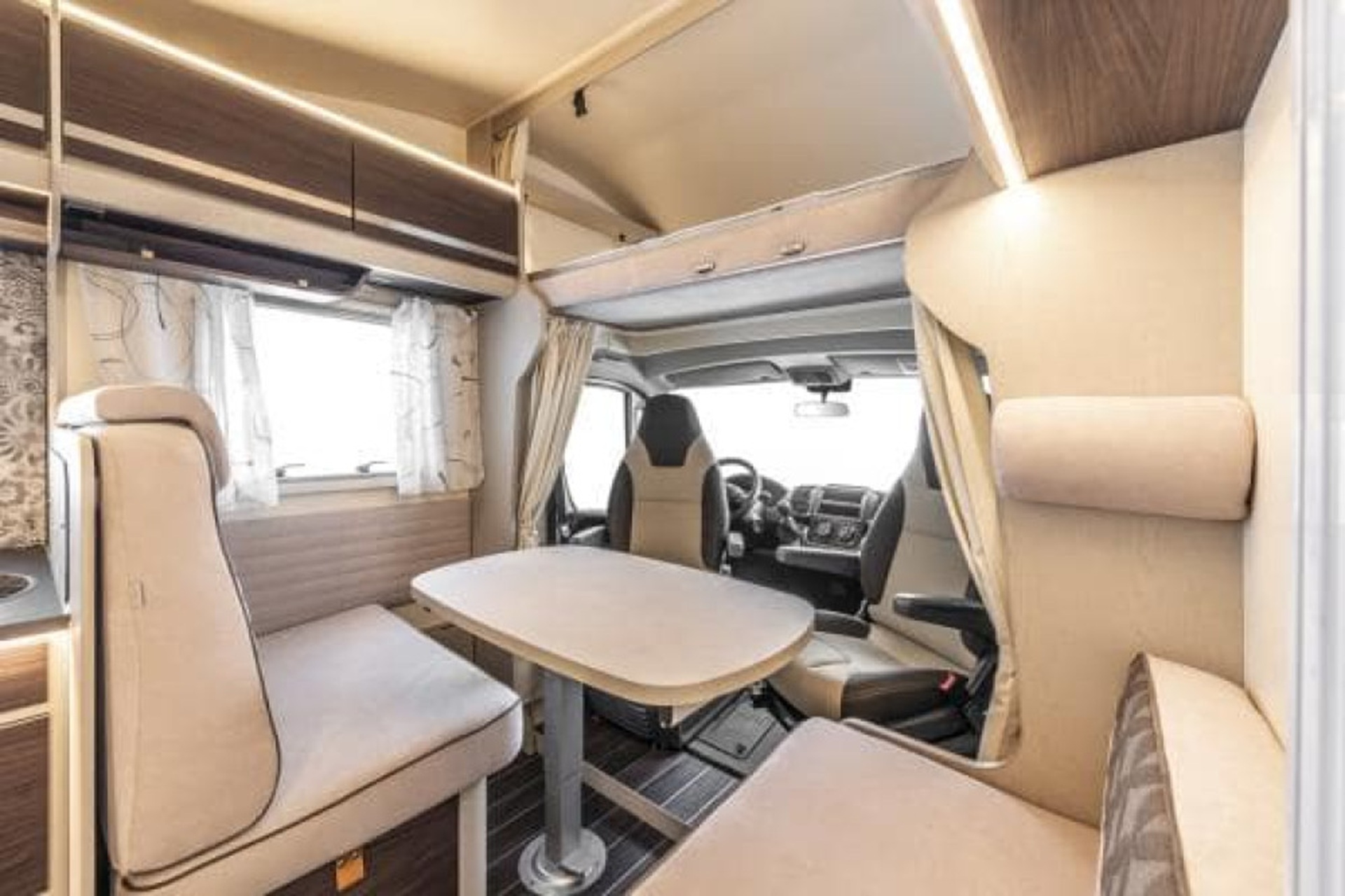 הקרוואן כולל מיטה זוגית מעל תא הנהג, שתי מיטות יחיד אחוריות הניתנות להפיכה למיטה זוגית גדולה, פינת אוכל, מטבח, מקלחת ושירותים.