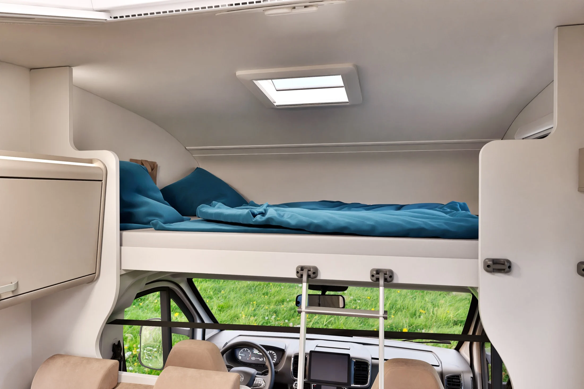 כולל בסדרת "תא עליון" הרוב המוחלט של הצי) מיטה זוגית מעל תא הנהג עם רשת הגנה מפני נפילות, בסדרת "משולב חלקי" מיטה זוגית יורדת מהתקרה מעל פינת האוכל עם רשת הגנה מפני נפילות, בשתי הסדרות פינת אוכל שהופכת למיטת יחיד, בחלק האחורי מיטת קומתיים קבועה עם רשת הגנה מפני נפילות במיטה העליונה, מטבח, פינת אוכל, מקלחת ושירותים.