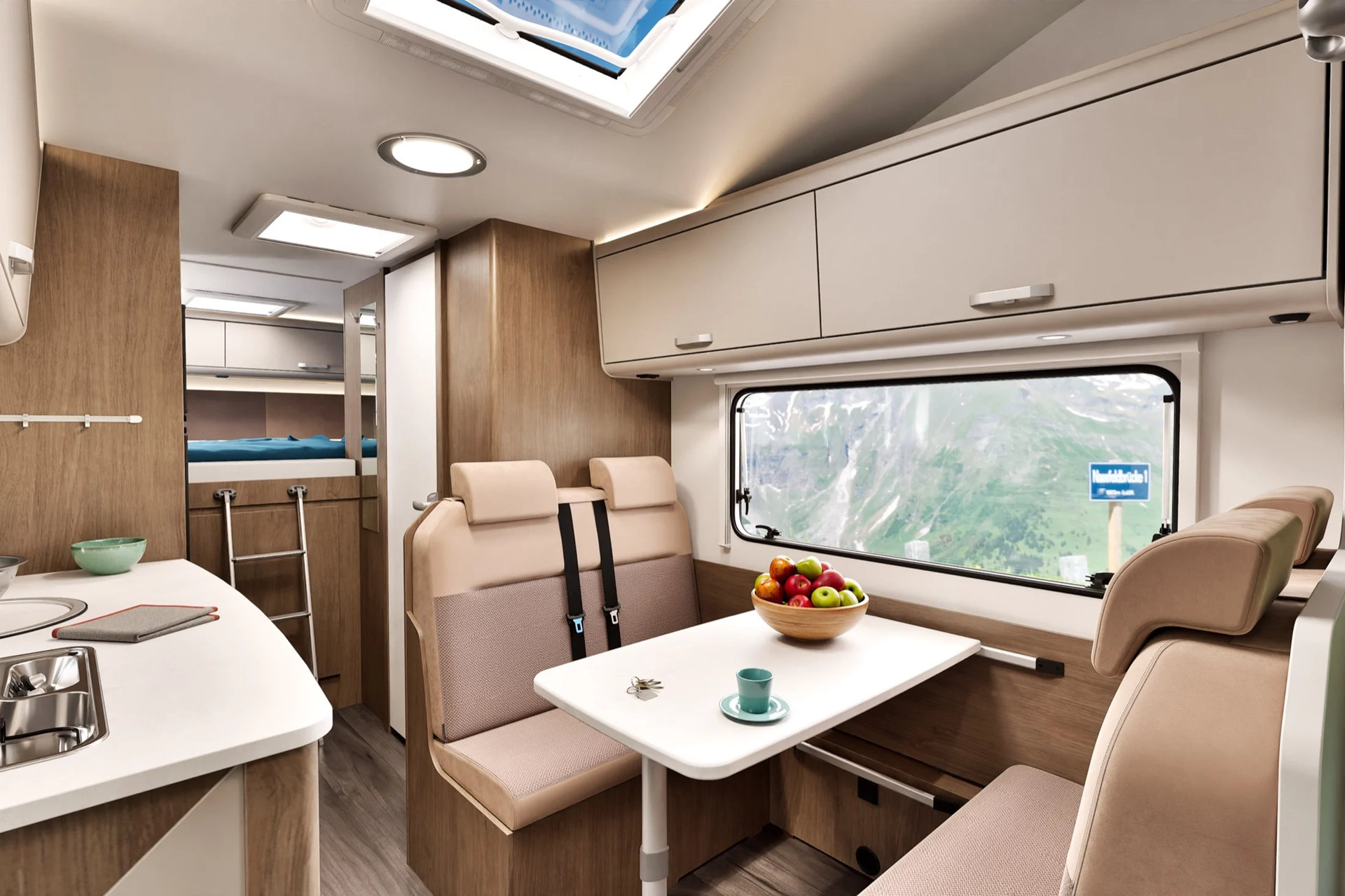 קרוואן מסדרת "תא עליון" מתאים לעד 4 מבוגרים וילד או עד 2 מבוגרים ו-3 ילדים. כולל מיטה זוגית קבועה מעל תא הנהג, מיטה זוגית אחורית קבועה ופינת אוכל ההופכת למיטת ילד, מטבח, מקלחת ושירותים.