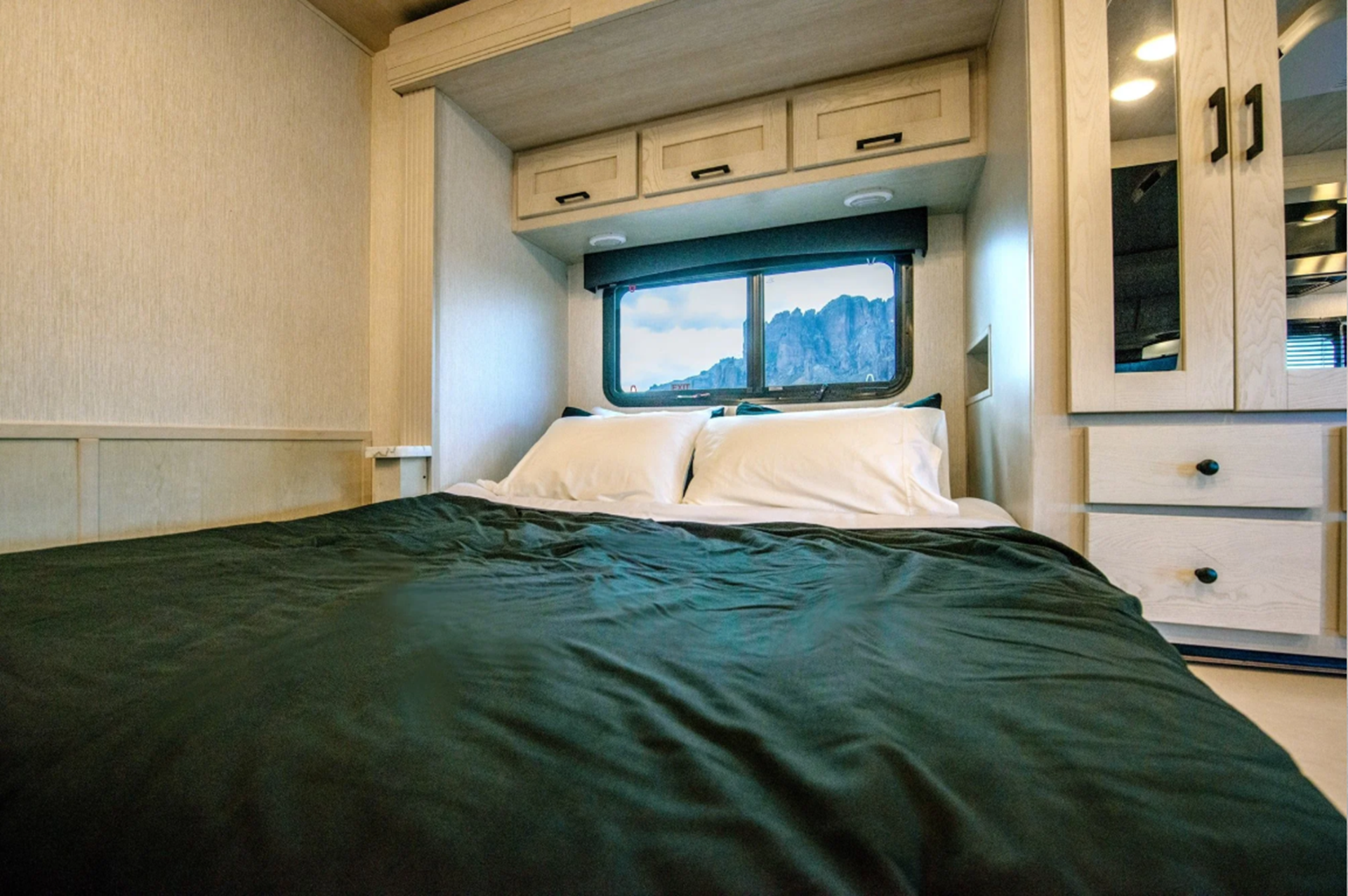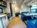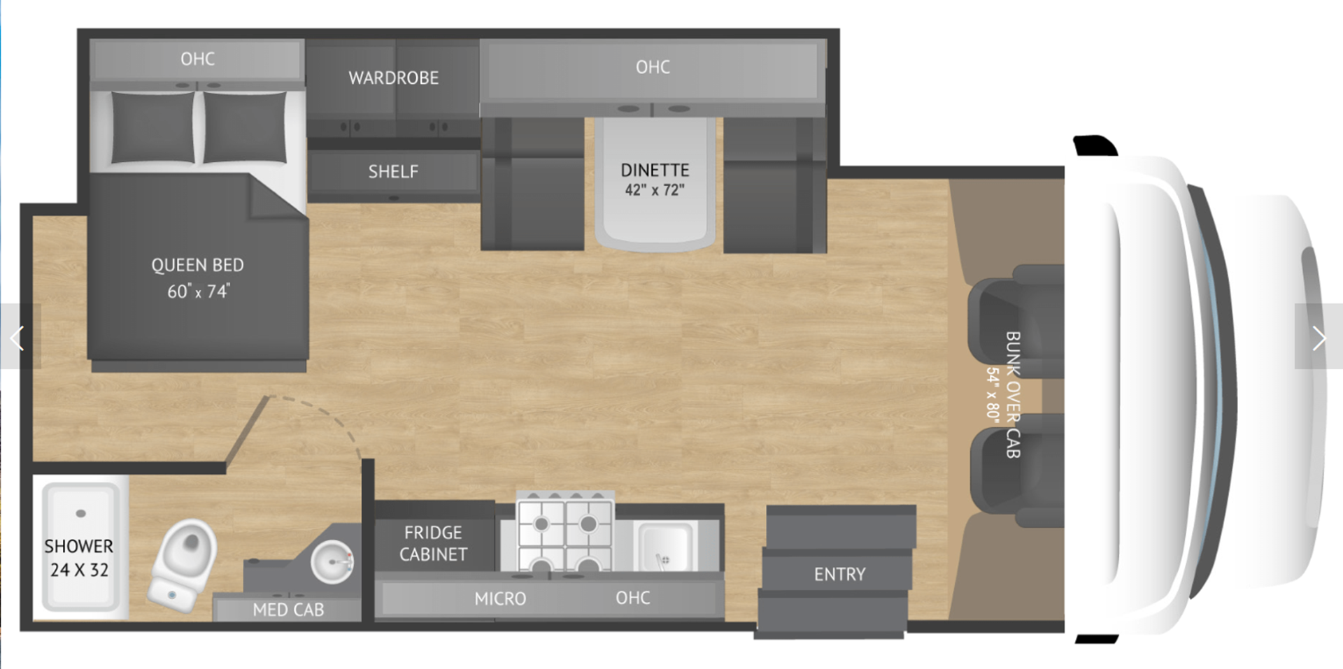 כולל מיטה זוגית מעל תא הנהג, מיטה זוגית אחורית, מיטה לילד מפינת האוכל, פינת אוכל, מטבח, מקלחת ושירותים